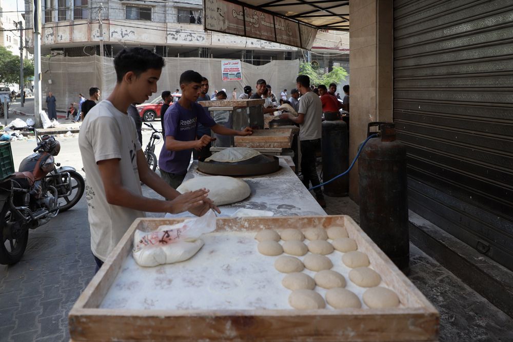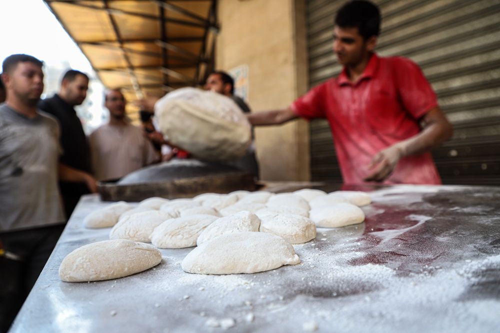 10月25日,在加沙地带南部城市汗尤尼斯,烘焙店工作人员在制作食品。当前,获准运入加沙地带的援助物资远远不能满足基本需求,食品短缺状况正日益恶化。
