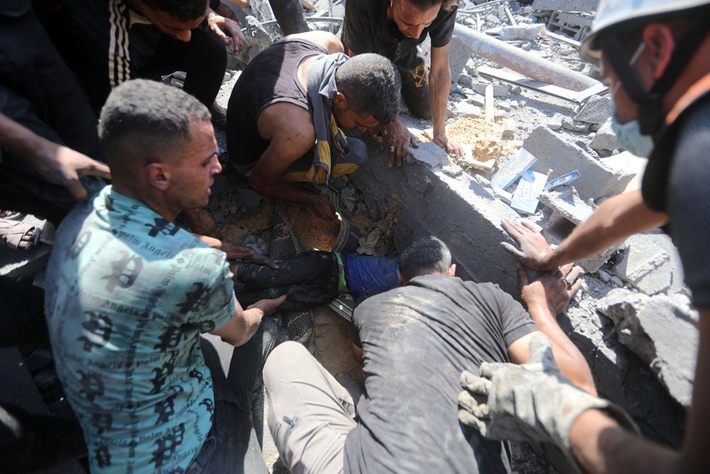 民众在加沙地带南部城市汗尤尼斯的废墟中搜救。
