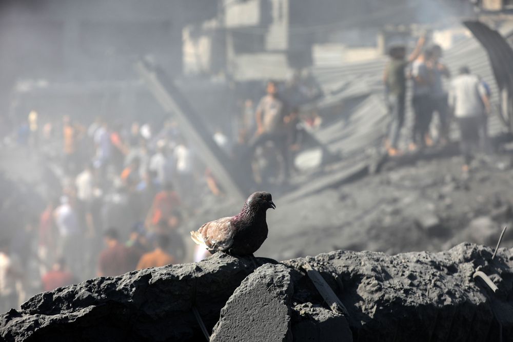10月26日,在加沙地带南部城市汗尤尼斯,一只鸽子停留在建筑废墟上。