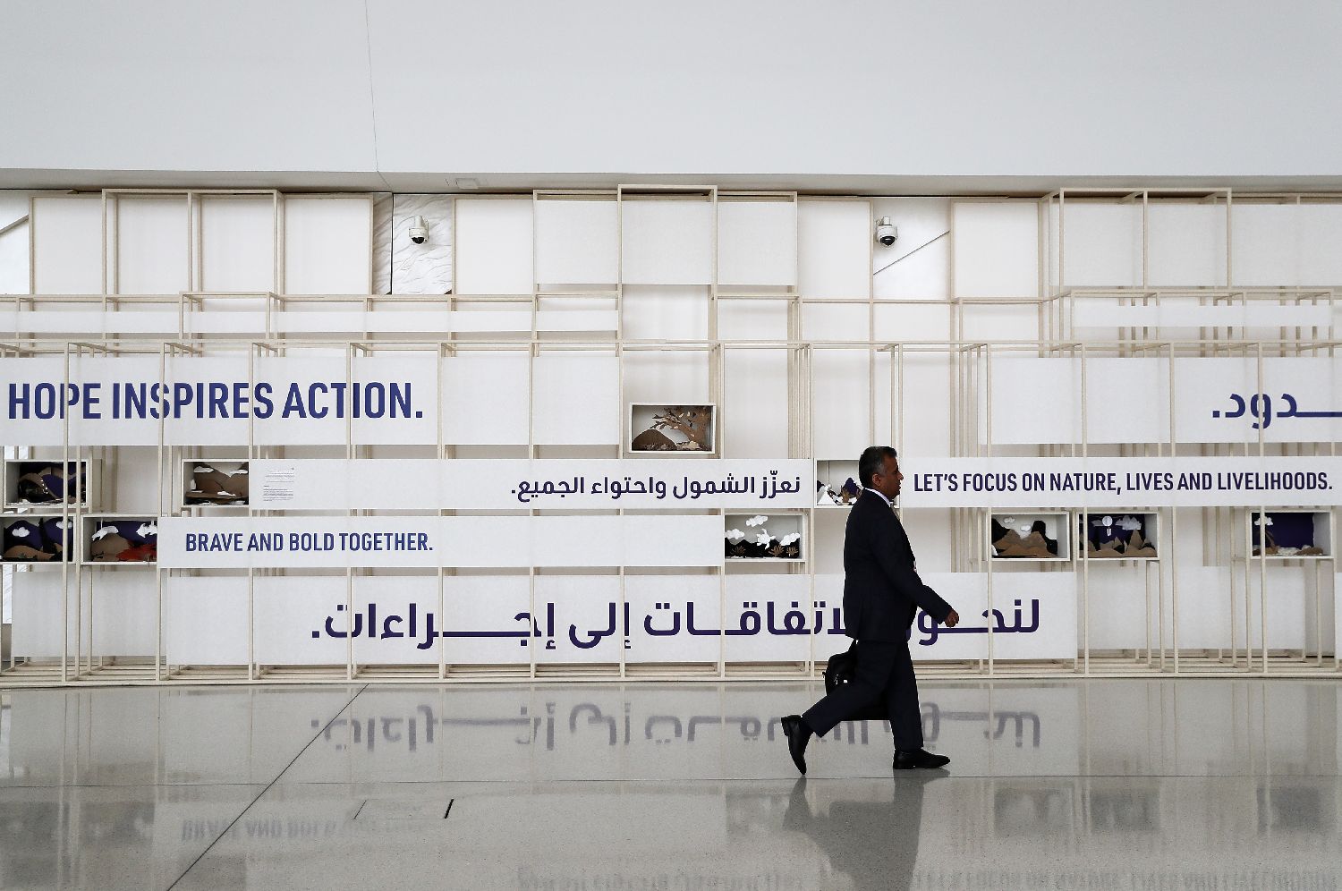 11月29日,在阿联酋迪拜,一名参会人员走过联合国气候变化大会的标语展板。