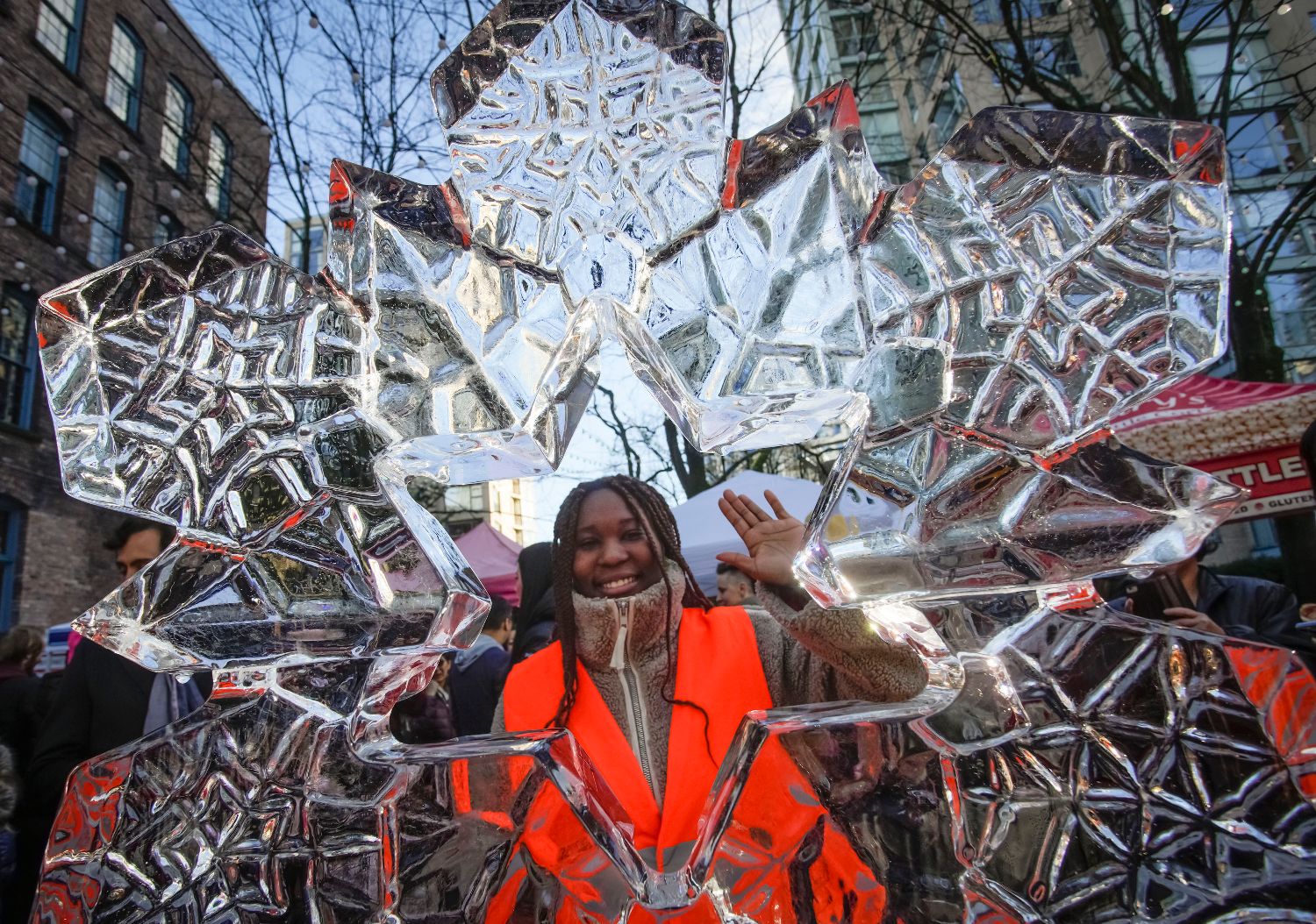 12月2日,一名市民在加拿大温哥华举办的“糖果镇”活动上与冰雕合照。