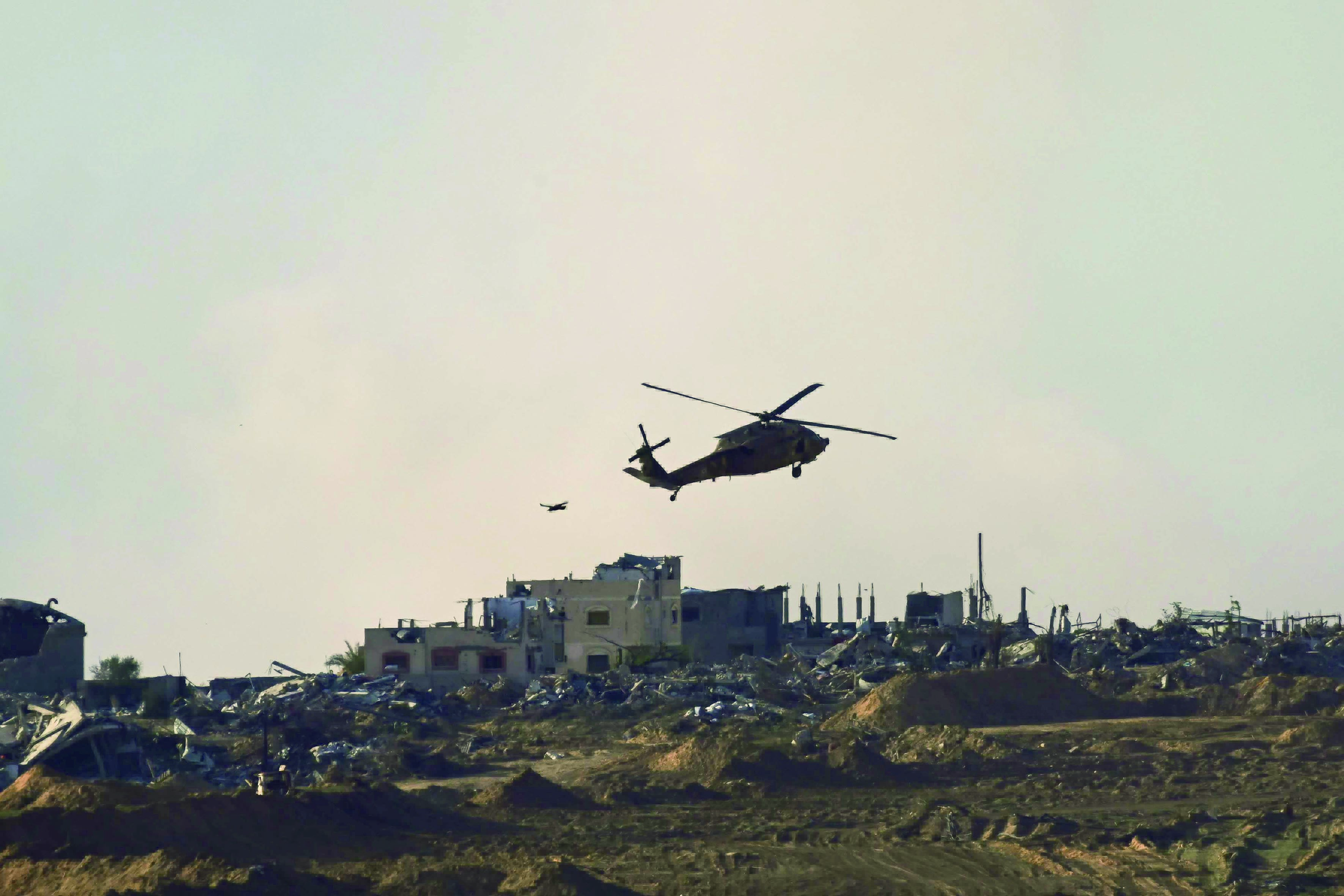 图为8日从加沙边境以色列一侧拍摄的盘旋在加沙上空的以军直升机。(图片来源:新华社)