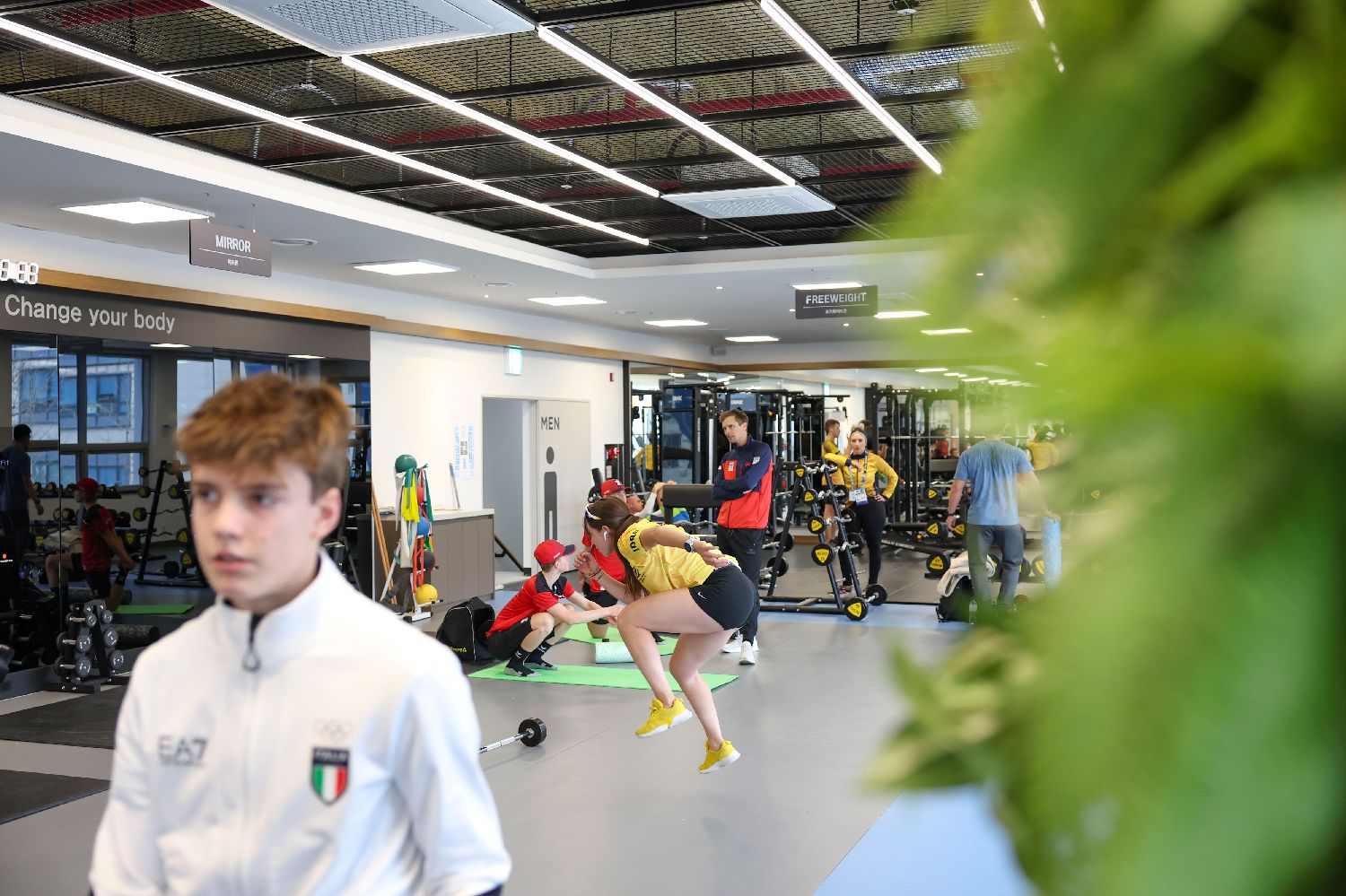 1月18日,运动员在冬青奥村多功能健身中心锻炼。