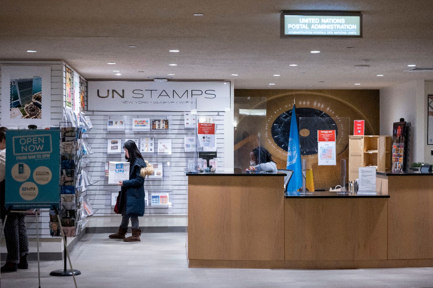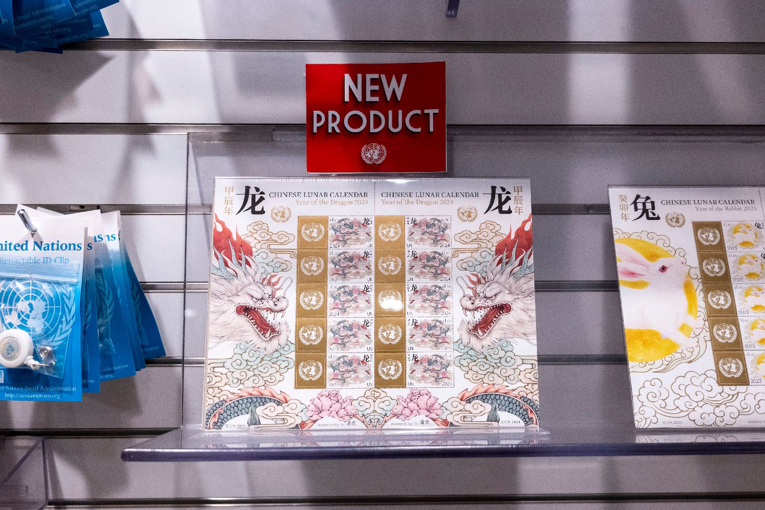 图为纽约联合国总部邮管处销售点提示甲辰龙年特别版邮票“新品”上架。(图片来源:本文图片均自中新社)