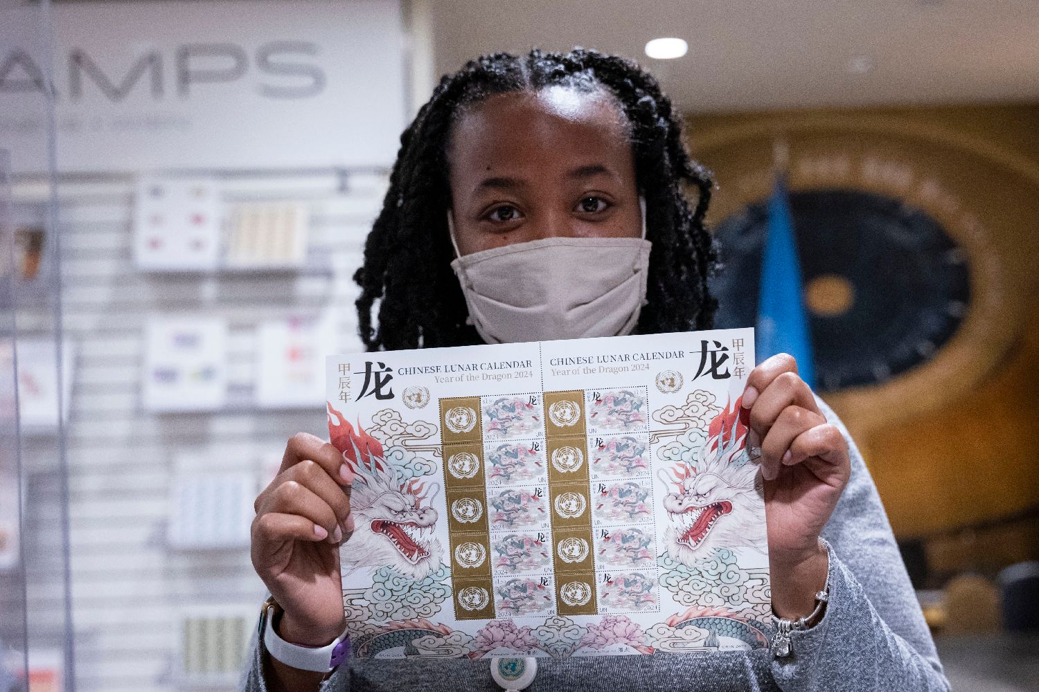 图为纽约联合国总部邮管处销售点的工作人员展示甲辰龙年特别版邮票版张。