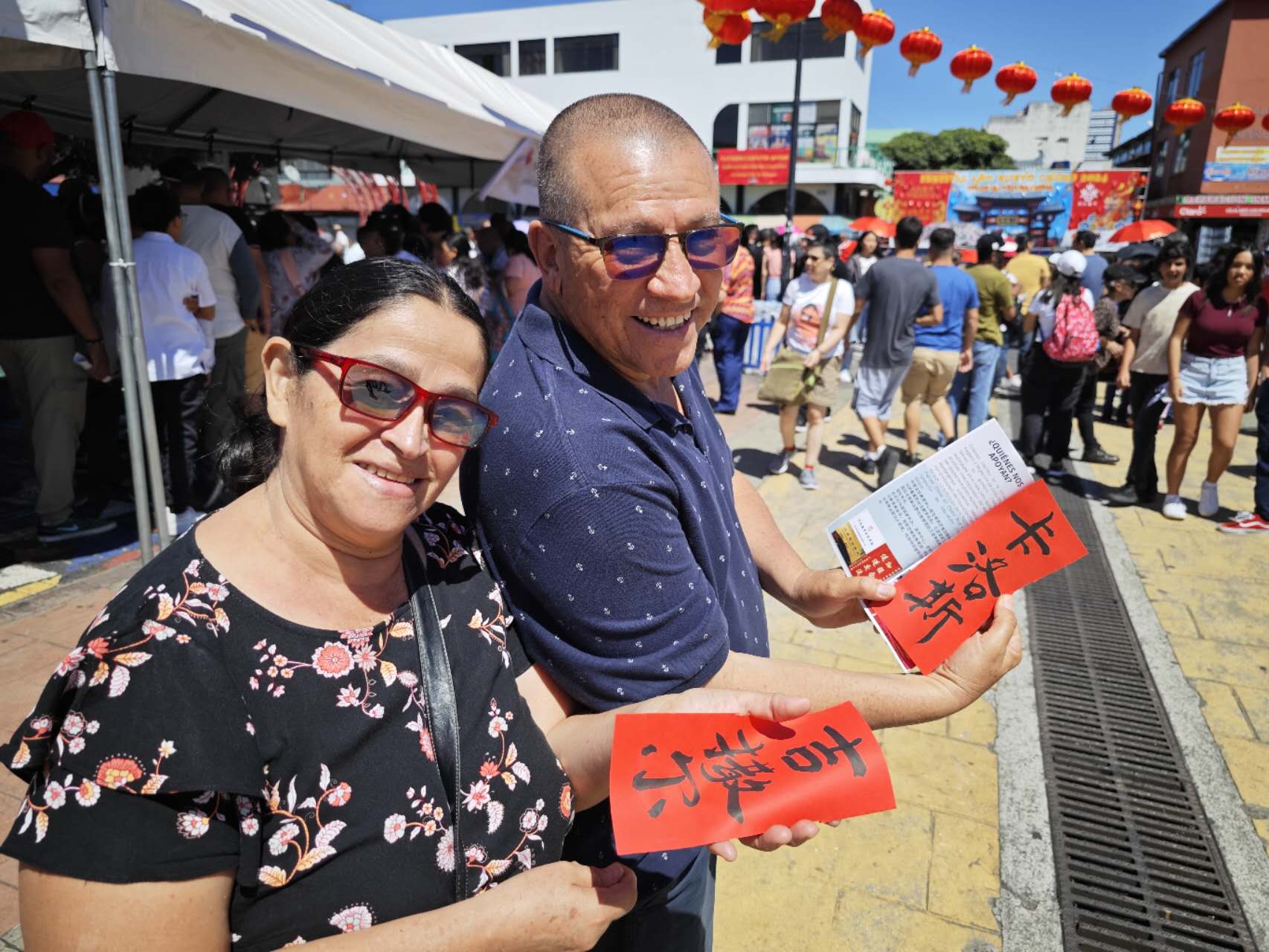 图为2月10日,在哥斯达黎加首都圣何塞中国街,哥斯达黎加民众展示用毛笔书写的自己的中文名。(图片来源:新华社)