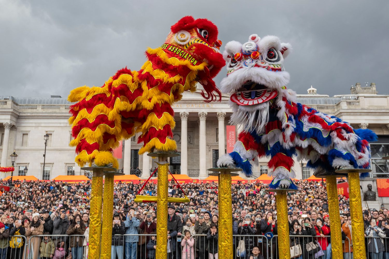 图为2月11日,在英国伦敦市中心的特拉法加广场,演员表演舞狮。(图片来源:新华社)
