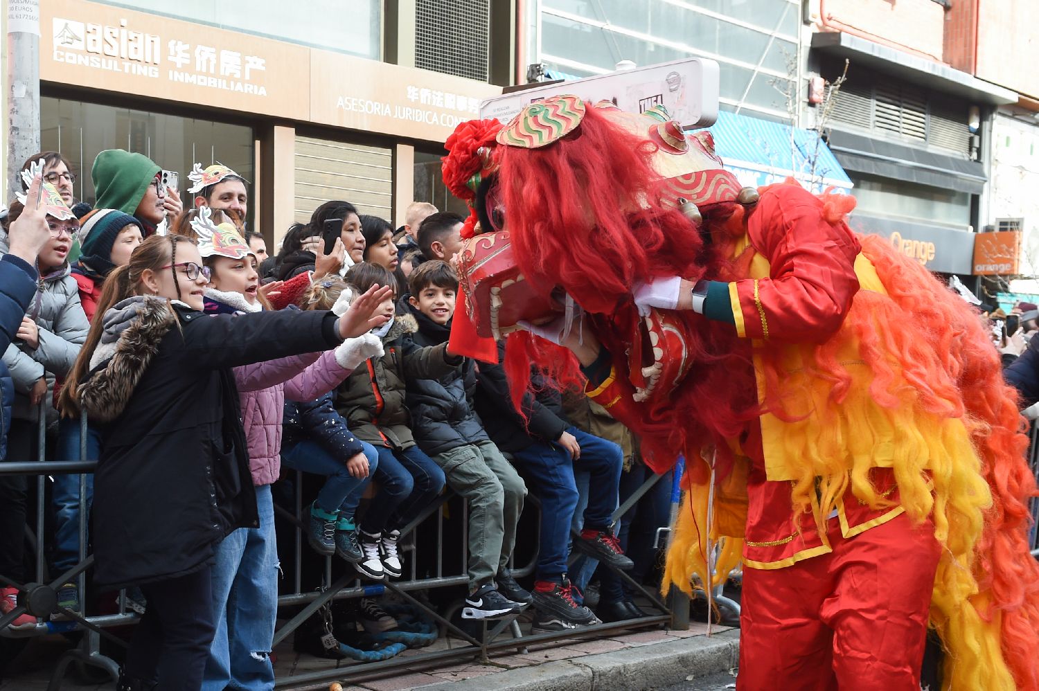 图为2月11日,在西班牙马德里,人们与舞狮演员互动。(图片来源:新华社)