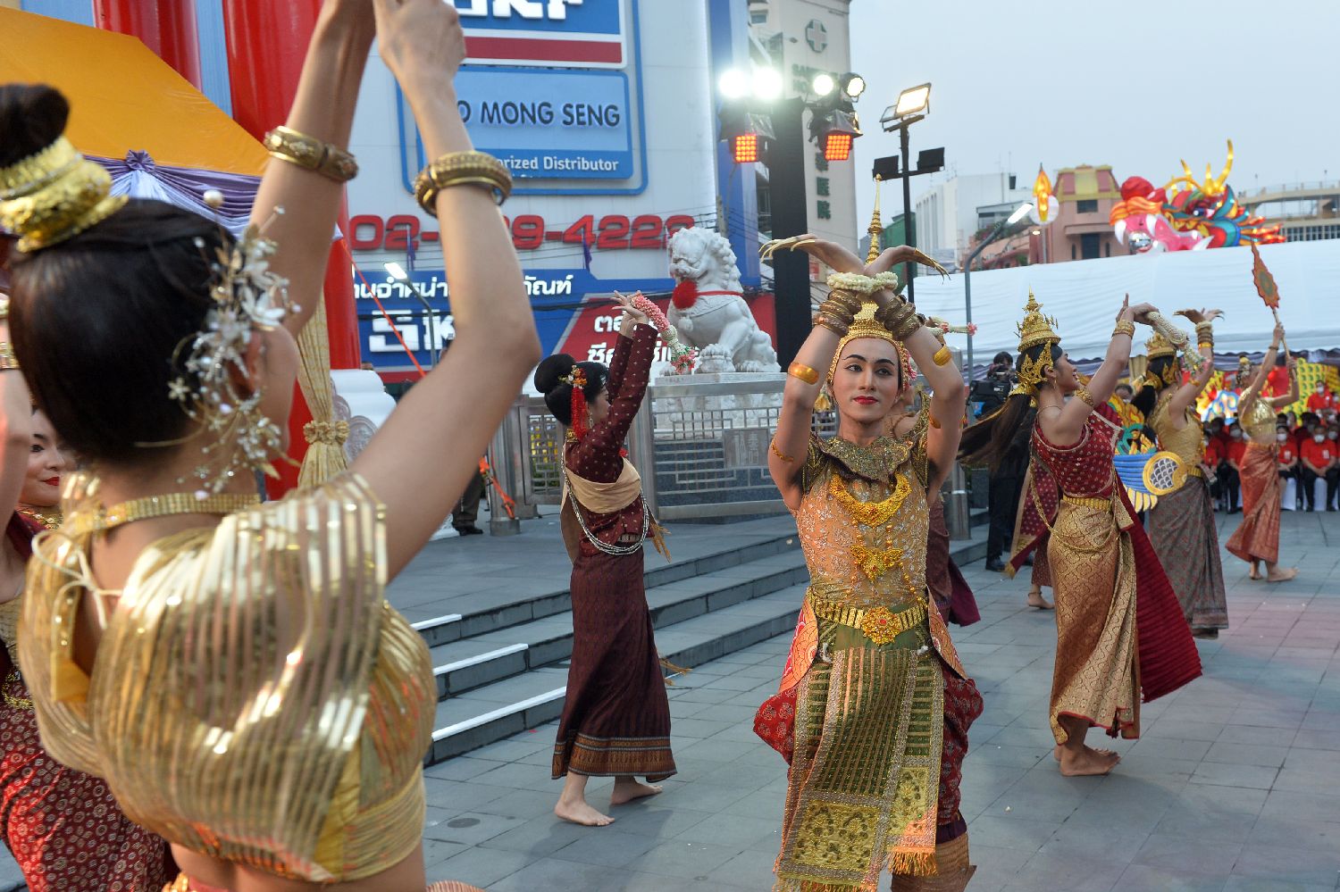 图为2月10日,演员在泰国曼谷唐人街举行的“欢乐春节”活动上跳舞。(图片来源:新华社)