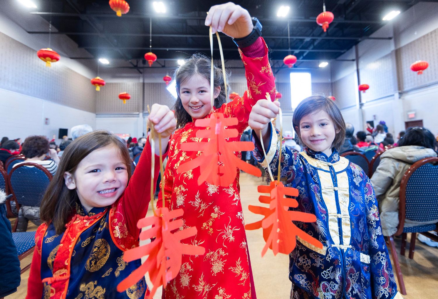 图为 2月10日,在加拿大多伦多,身穿中国传统服饰的儿童在庙会上展示剪纸作品。当日,加拿大大多伦多中华文化中心举办2024年中国农历龙年春节庙会活动,不仅有内容丰富的中国剪纸、折纸、捏面人等体验活动,还有中国武术与舞龙、舞狮等表演,吸引了众多观众共度中国春节大年初一。(图片来源:新华社)