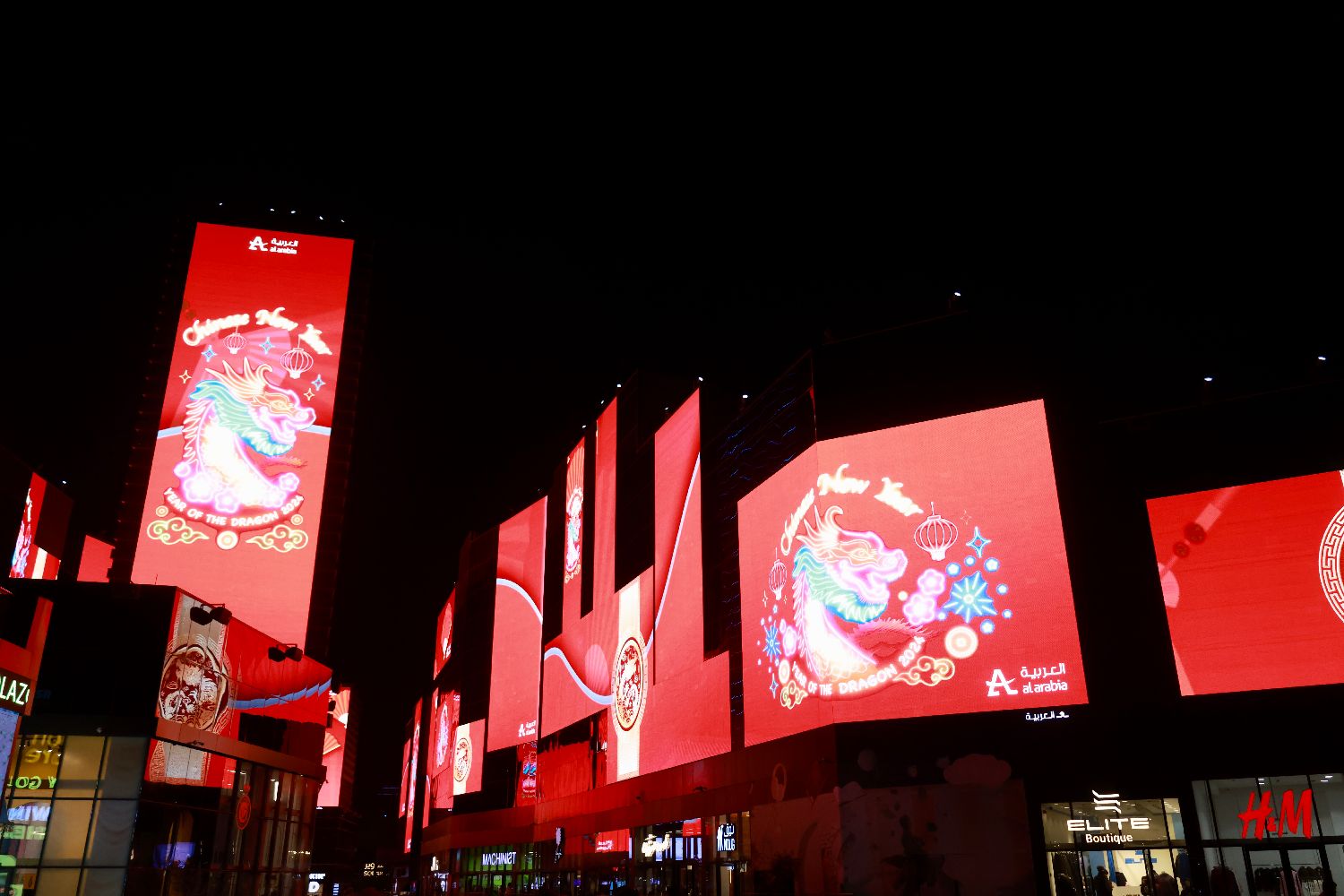 图为2月10日晚,沙特阿拉伯首都利雅得的“利雅得城市大道”广场数十块LED屏幕播放庆祝春节的主题视频。这是利雅得连续三年点亮“中国红”以庆祝中国春节。(图片来源:新华社)