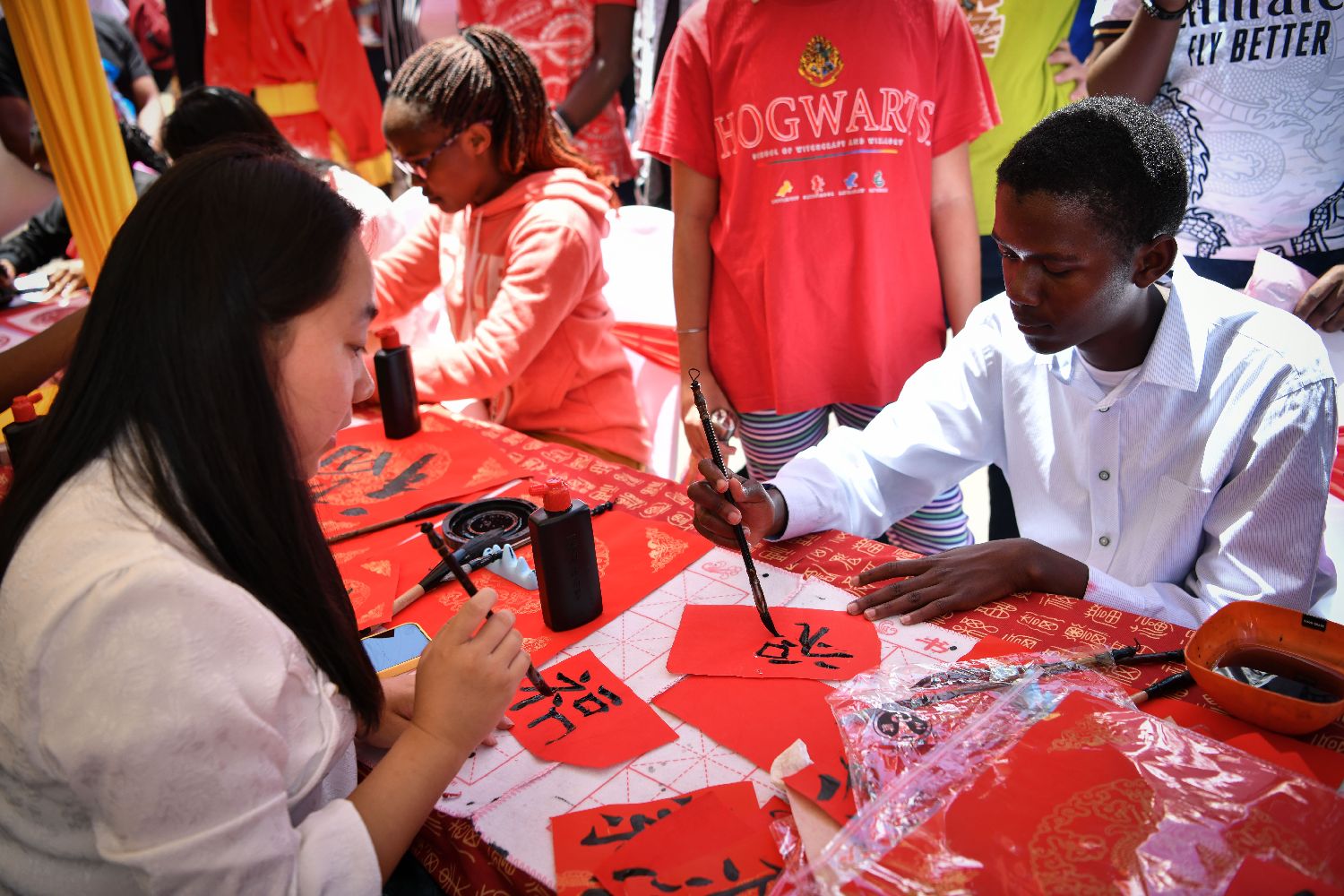 图为2月10日,在肯尼亚首都内罗毕,人们在内罗毕中国春节庙会上体验中国书法。当日,首届内罗毕中国春节庙会活动拉开帷幕,吸引上千人参与。包括中国驻肯尼亚大使馆、肯尼亚华侨华人联合会、肯尼亚中国妇女联合总会在内的48家中国机构与企业在庙会上齐聚一堂,开展文化交流活动。在肯华侨华人与肯尼亚各界人士共庆中国农历新年。(图片来源:新华社)
