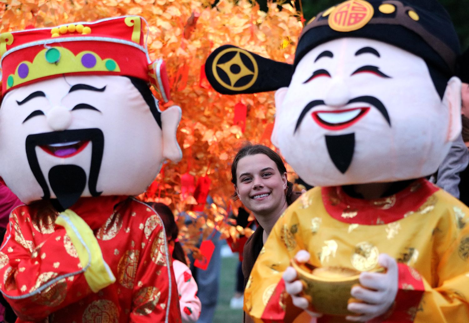 图为2月9日,在新西兰南岛城市克赖斯特彻奇的海格力公园,一名女子与“财神”人偶合影。“新春嘉年华”日前在新西兰南岛最大城市克赖斯特彻奇市举行。活动以大型灯展为依托,融入文艺表演、中国美食、传统游戏、大型烟花秀等,展示了底蕴深厚的中国文化。(图片来源:新华社)