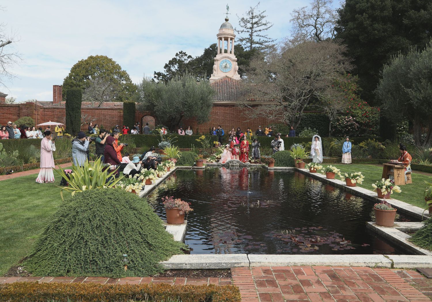 3月2日,在美国加利福尼亚州伍德赛德斐洛里庄园,一名汉服爱好者(前右)表演古筝独奏。(图片来源:本文图片均据新华社)