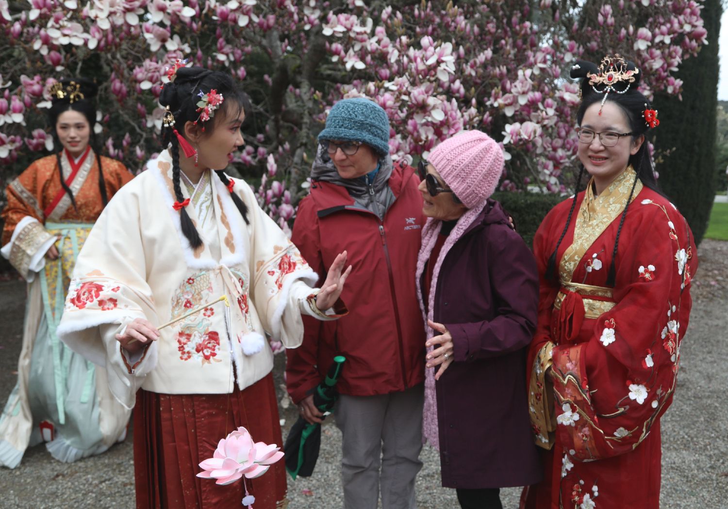 3月2日,在美国加利福尼亚州伍德赛德斐洛里庄园,一名汉服爱好者(前左一)与游客交流。