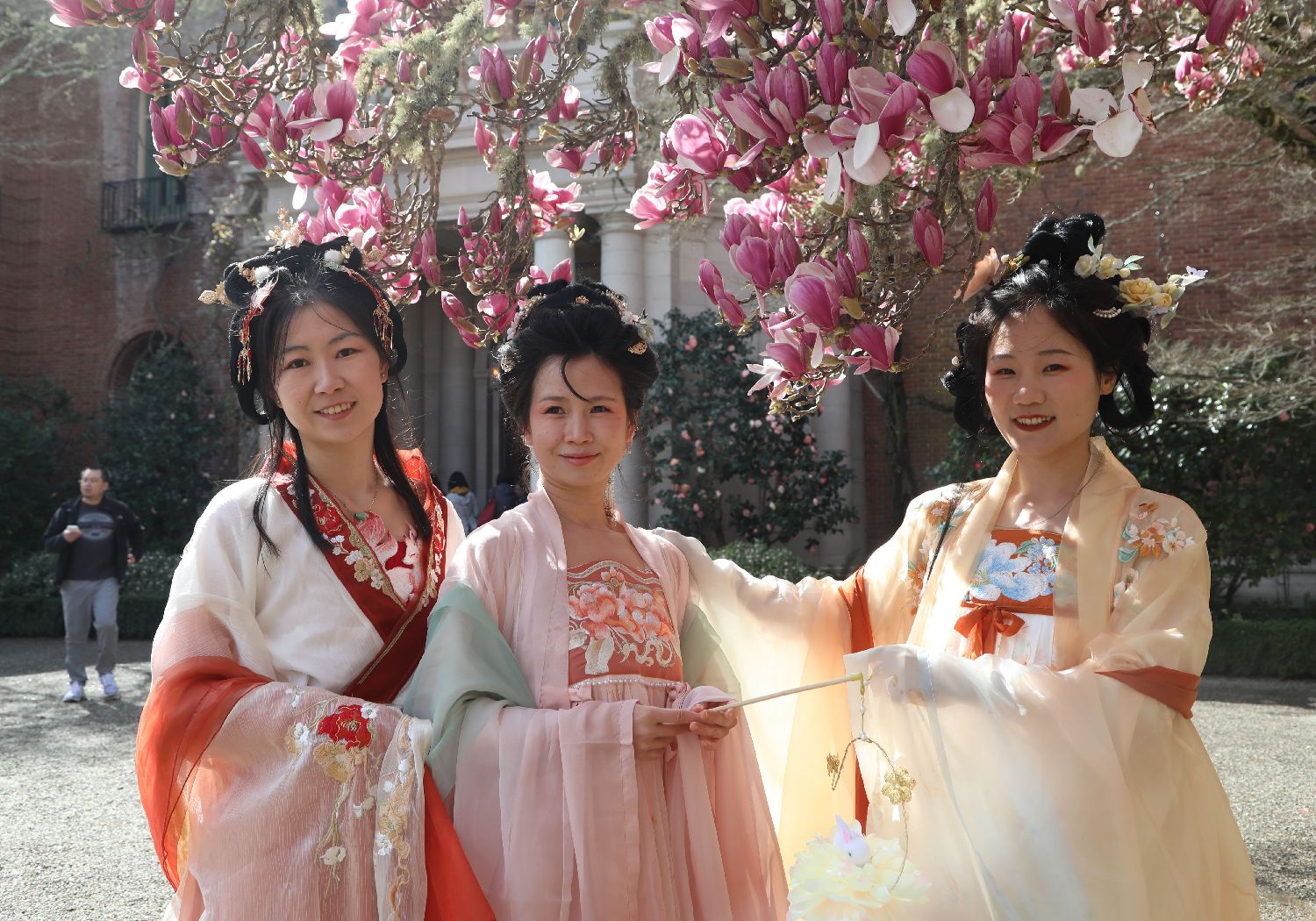 3月2日,在美国加利福尼亚州伍德赛德斐洛里庄园,三名汉服爱好者参加花朝节活动。