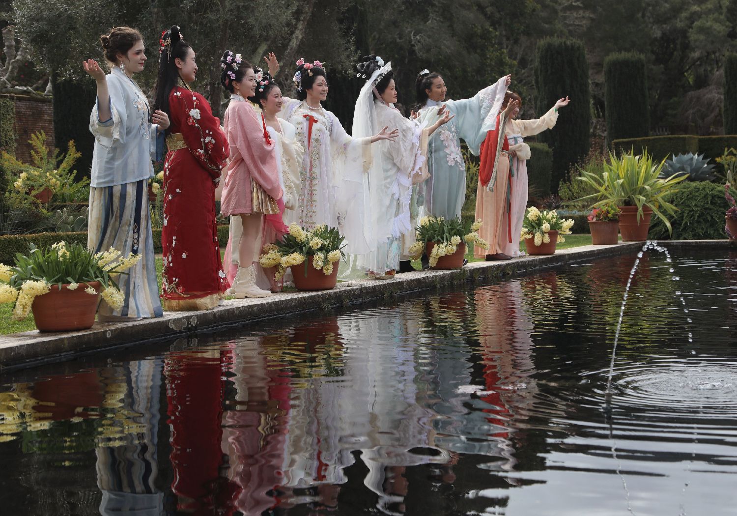 3月2日,在美国加利福尼亚州伍德赛德斐洛里庄园,汉服爱好者演示花朝节仪式。