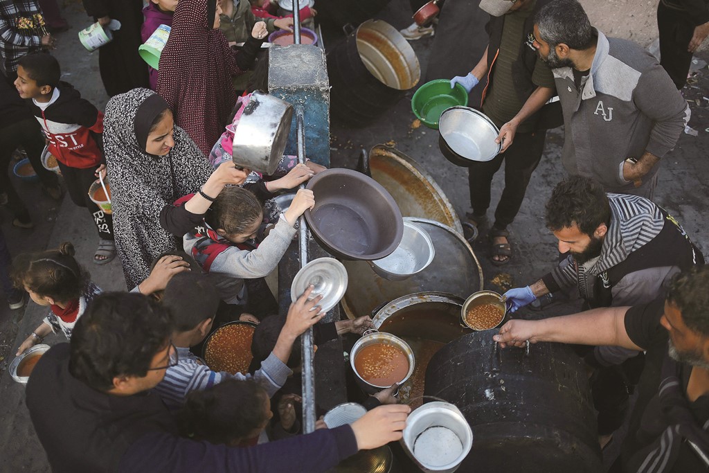 11日,流离失所的巴勒斯坦人在加沙地带南部拉法领取慈善机构捐赠的食物。(图片来源:视觉中国)