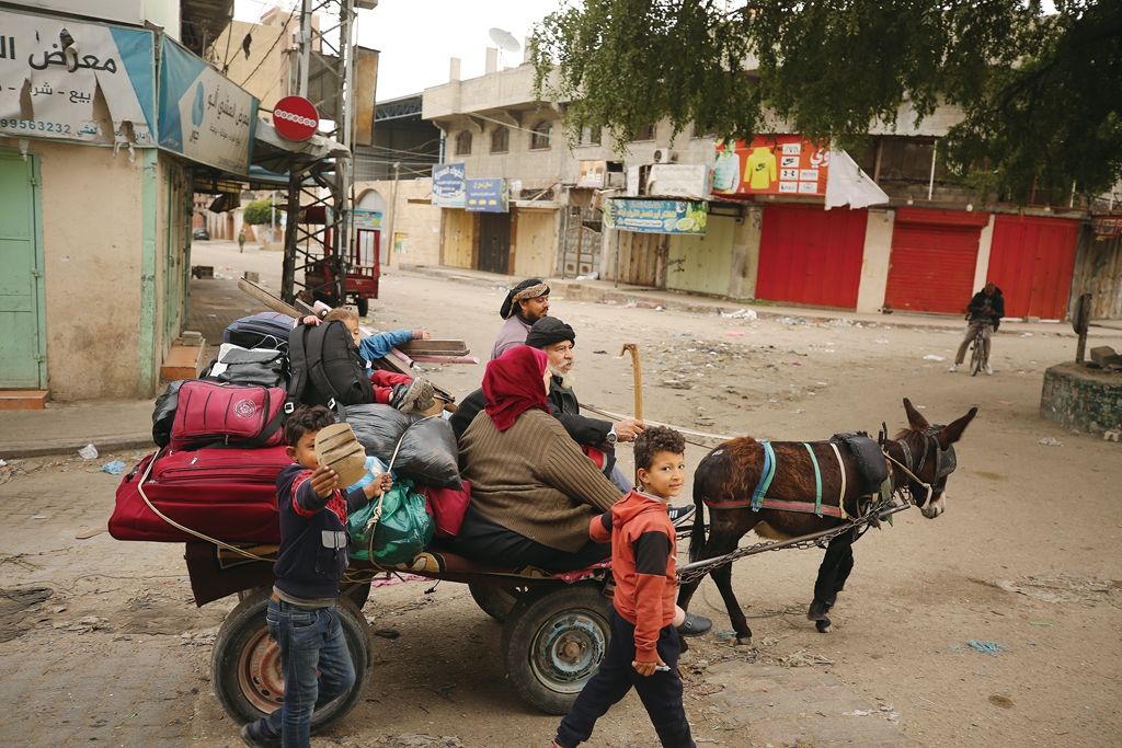 3月18日,加沙城,以色列军队用坦克和重炮包围了希法医院,巴勒斯坦居民带着物品离开该地区。(图片来源:视觉中国)