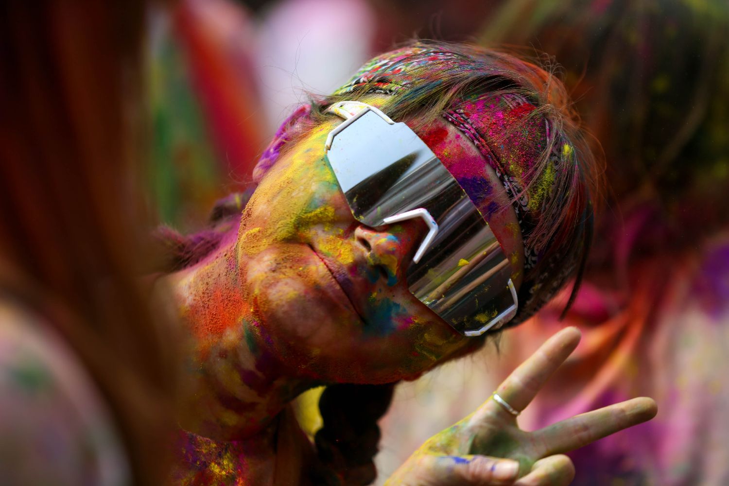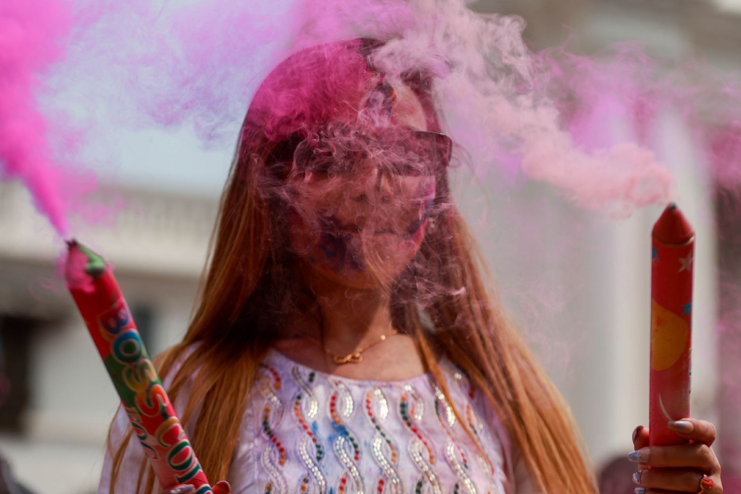 3月24日,女子在尼泊尔加德满都参加洒红节庆祝活动。
