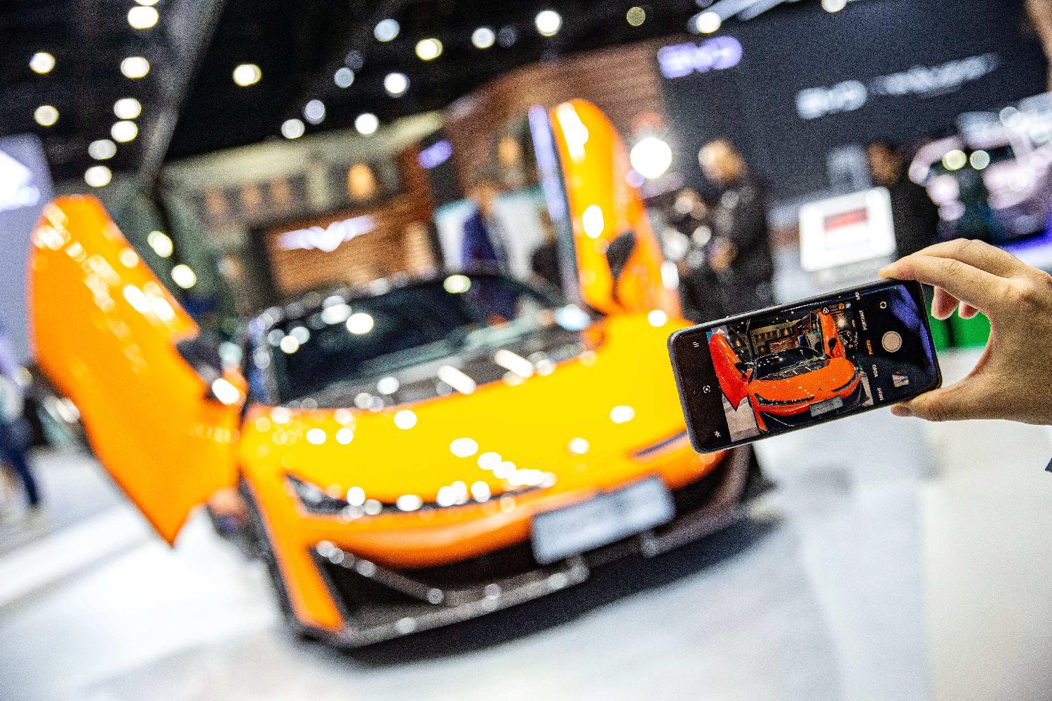 3月27日,一名观众在泰国曼谷国际车展上拍摄广汽埃安Hyper SSR汽车。