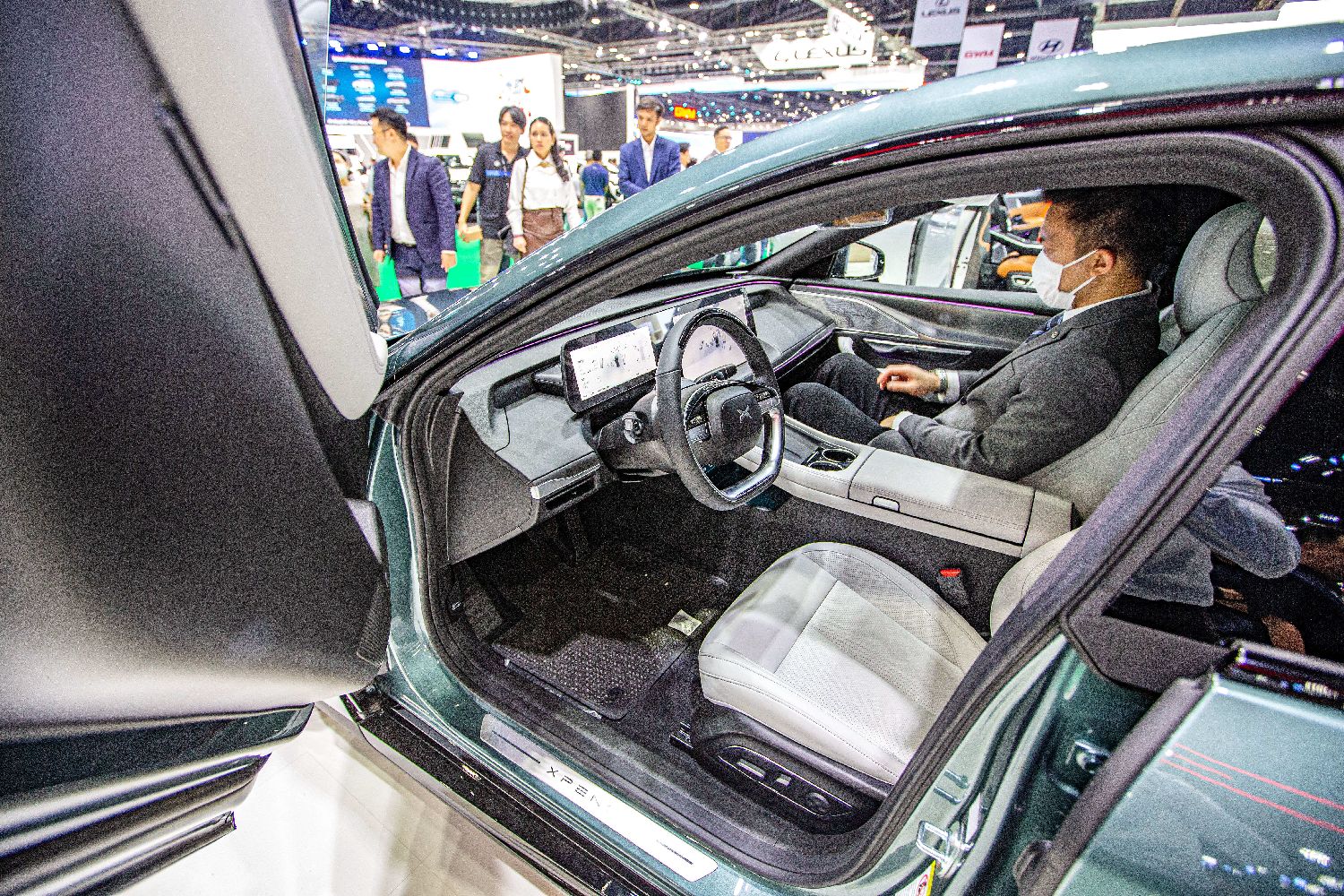 3月27日,一名观众在泰国曼谷国际车展上体验小鹏P7i汽车。