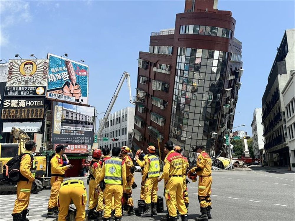 在花莲市,地震造成一栋大楼严重倾斜(4月3日摄)。(图片来源:台湾中时新闻网供新华社)