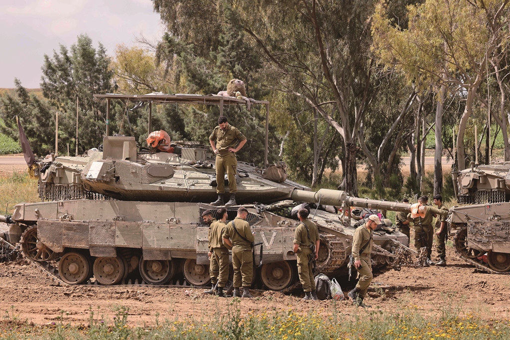 图为在以色列与加沙地带南部边境,以色列士兵聚集在驻扎的陆军坦克周围。(图片来源:视觉中国)