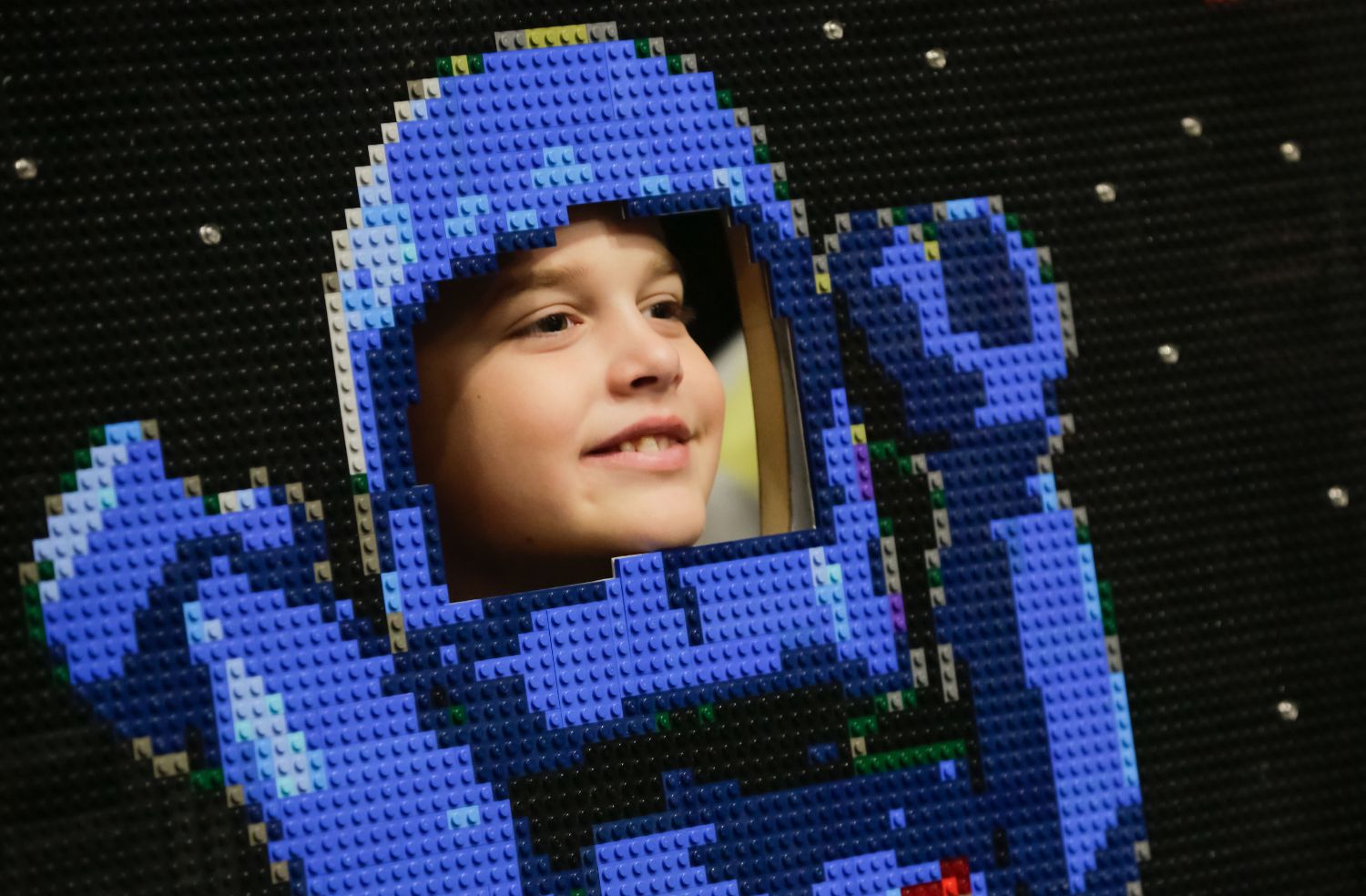 4月20日,在加拿大里士满,一名男孩在乐高积木展上与展品合照。