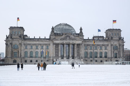 2月7日,人们站在德国柏林国会大厦前的雪地上。(图片来源:本文图片除标注外均自新华社)