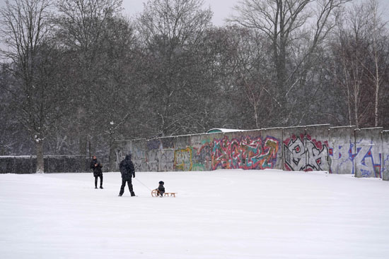 2月8日下午,一家三口在柏林墙遗址纪念公园内的积雪上玩耍。(图片来源:中新社)