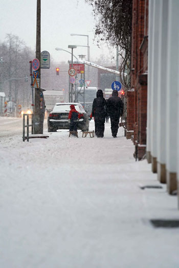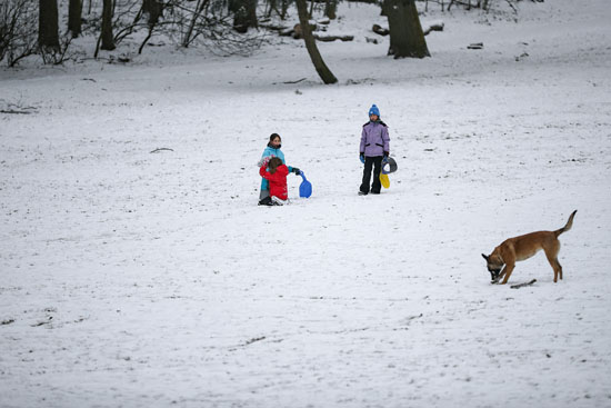 家长带着玩雪橇的孩子经过一条被积雪覆盖的街道。(图片来源:中新社)