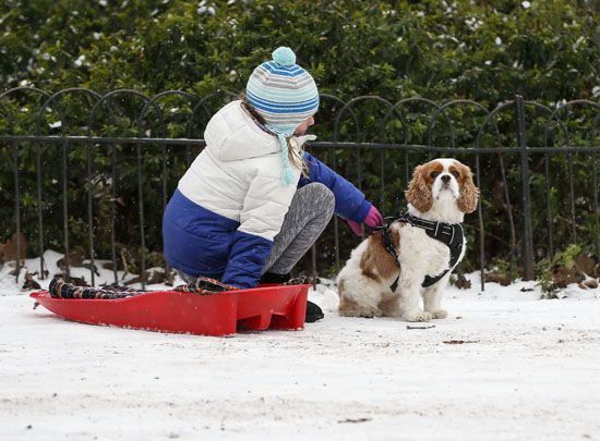 2月8日,在英国伦敦,一名女孩和宠物狗在雪地上玩耍。