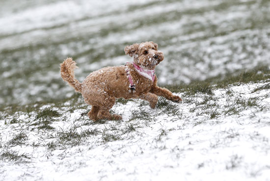 2月8日,在英国伦敦,一只宠物狗在雪地上玩耍。