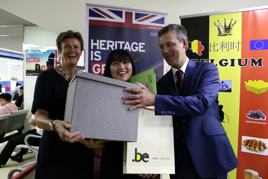 英国比利时“一站式签证”申请达千份,签证申请者收到两国礼包。(图片来源:中新社)