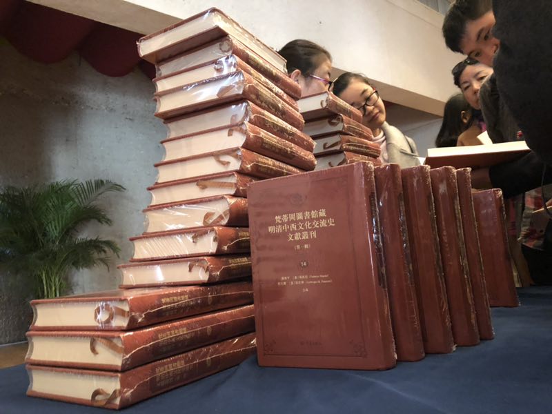9日,《梵蒂冈图书馆藏明清中西文化交流史文献丛刊》推介会在意大利驻华使馆举办,图为该丛书已出版的第一辑,共收录170部天主教类文献。(图片来源:北京《环球时报》)