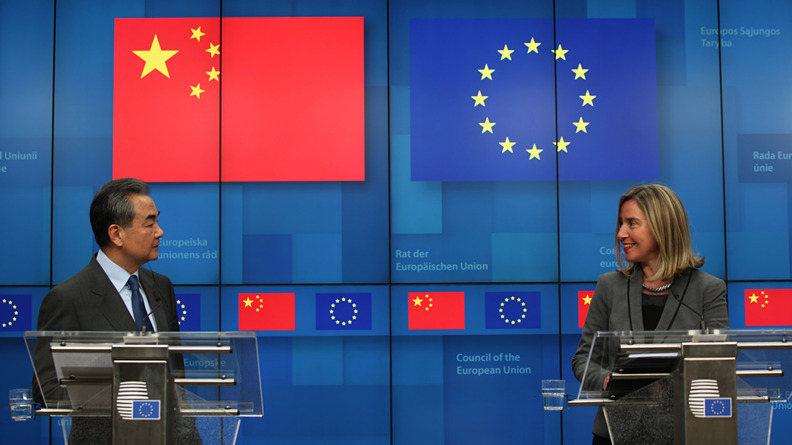 中国国务委员兼外交部长王毅和欧盟外交与安全政策高级代表莫盖里尼。(图片来源:中新社)