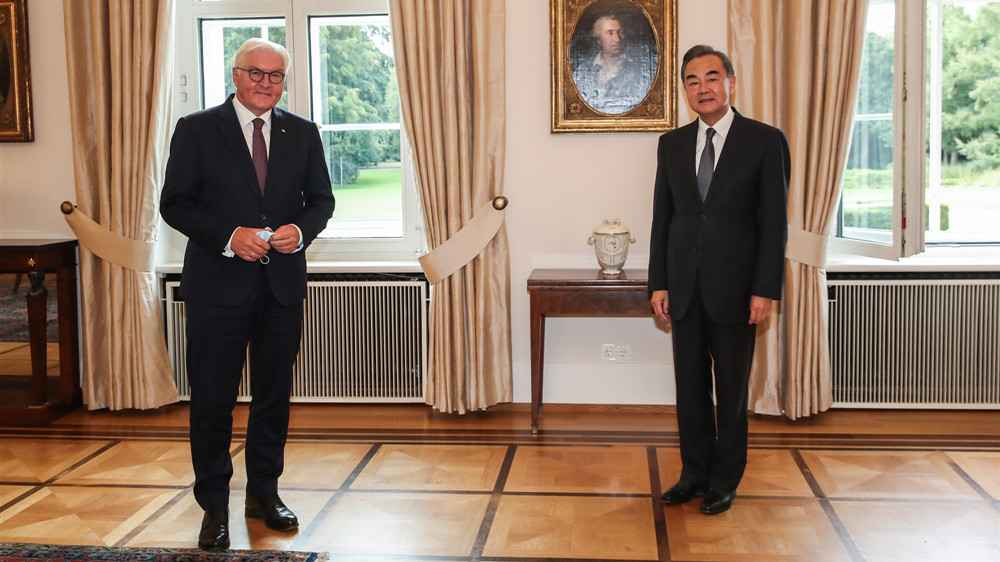 9月1日,德国总统施泰因迈尔(左)会见王毅。(图片来源:新华社)
