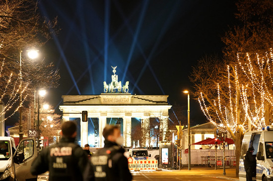 今年受新冠疫情影响,柏林勃兰登堡门取消了烟火表演并部署大量警力实施封锁。图为2020年12月31日晚,多名警察在德国柏林勃兰登堡门前值守。(图片来源:本文图片均自中新社)