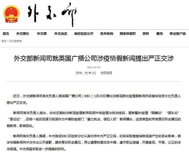 中国外交部官网4日发布消息称,近日,外交部新闻司有关负责人就英国广播公司(BBC)1月29日播出涉新冠肺炎疫情假新闻向该媒体驻京分社负责人提出严正交涉。