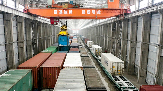 2月7日,在新疆阿拉山口口岸的中欧班列换装库里,工作人员在吊装集装箱。(图片来源:新华社)