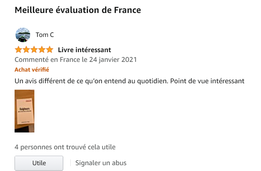 一名亚马逊用户在维瓦斯《维吾尔族假新闻的终结》这本书下评论说:“和我们每天听到的看法不一样,很有意思的观点。”(图片来源:亚马逊网站截图)