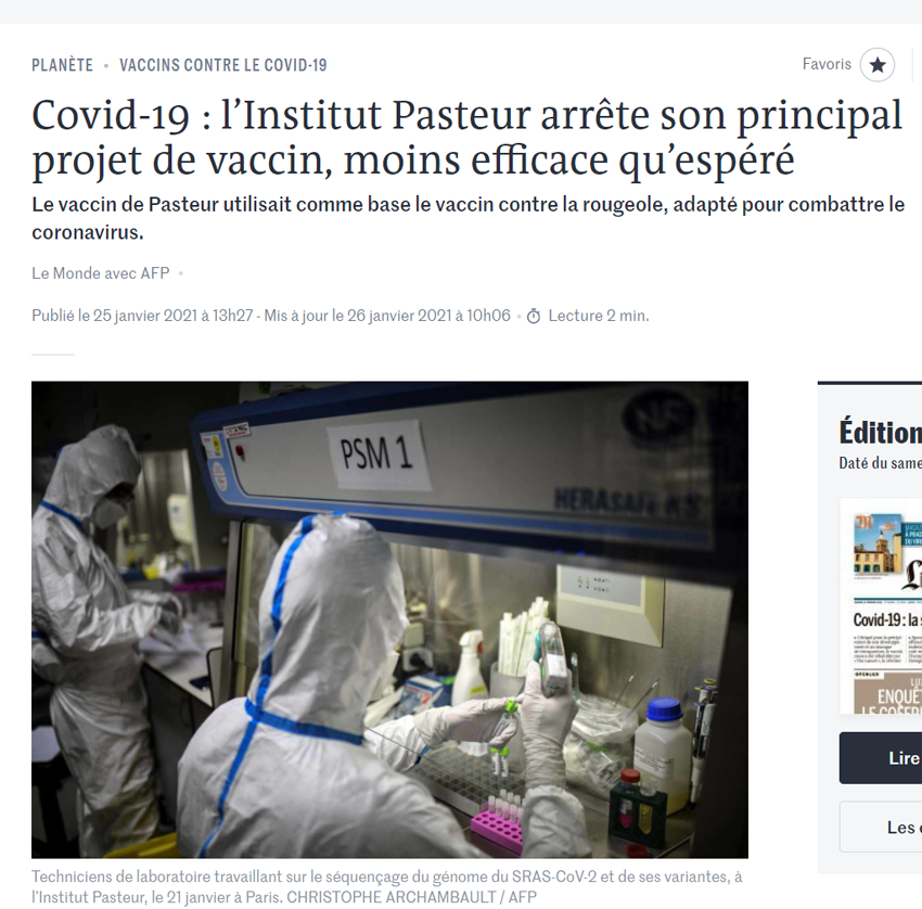 2021年1月25日,巴斯德研究所宣布,由于效果低于预期,决定停止研发其重点投入、进程最快的一种新冠疫苗。(图片来源:《世界报》报道截图)