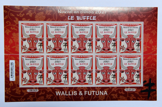 2月12日,正值大年初一,法国海外属地瓦利斯和富图纳发行牛年生肖邮票。中新社报道,该邮票全套一枚,以小版张形式发售,邮票印量为2.5万枚。