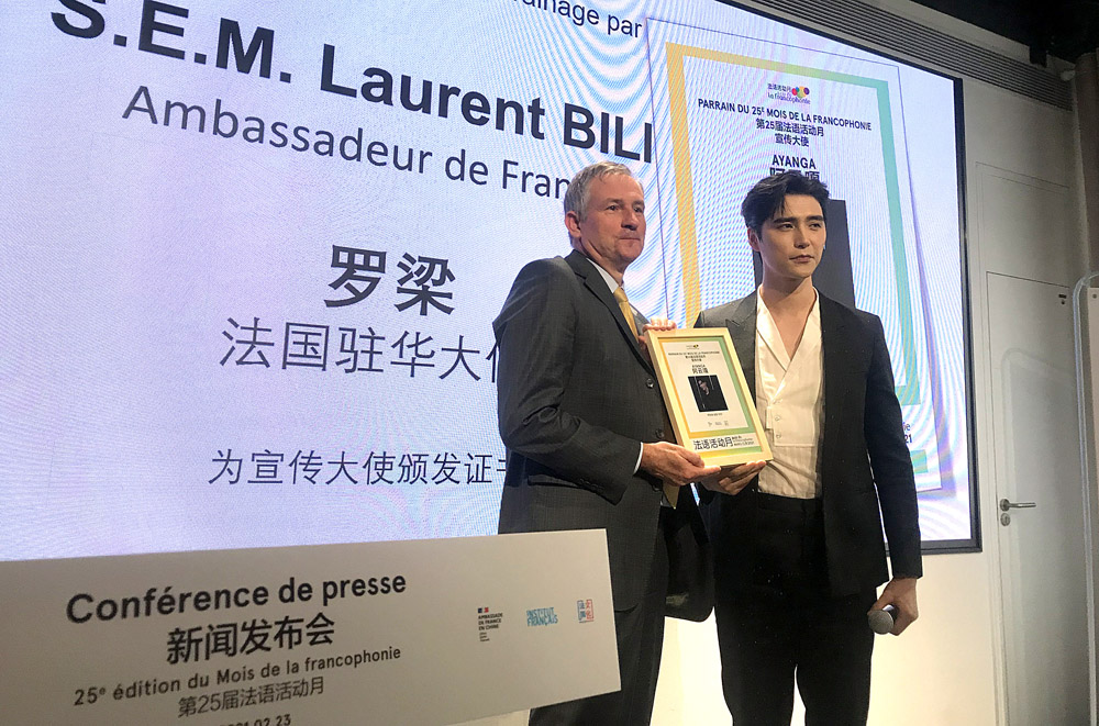2月23日,第25届法语活动月新闻发布会在北京举行。图为发布会现场,法国驻华大使罗梁(LaurentBILI)为宣传大使阿云嘎(右)颁发证书。(图片来源:本文图片均由欧洲时报特约记者赵晨曦 摄)