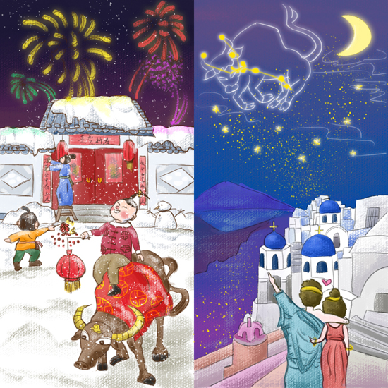 左图为古代中国,牛年人们庆祝的场景。右图为古代希腊,人们在观看金牛座。