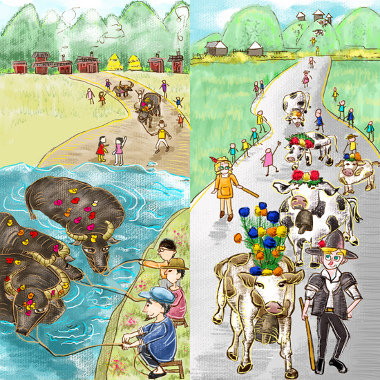左图为中国的牛王节。右图为欧洲的赶牛下山节。