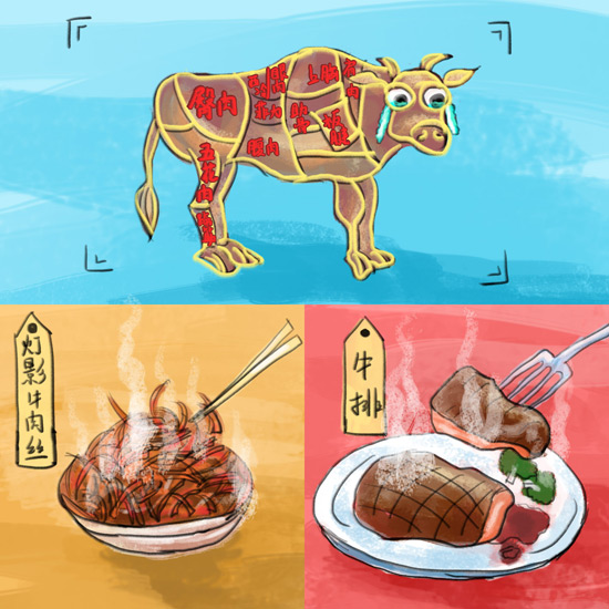 上图为牛身上的部位示意图。左下为中国美食灯影牛肉丝。右下为欧洲美食牛排。