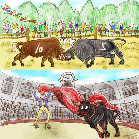 上图为中国少数民族斗牛。下图为西班牙斗牛士斗牛。
