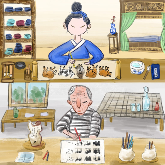 上图为韩滉在画《五牛图》。下图为毕加索在画《公牛》。
